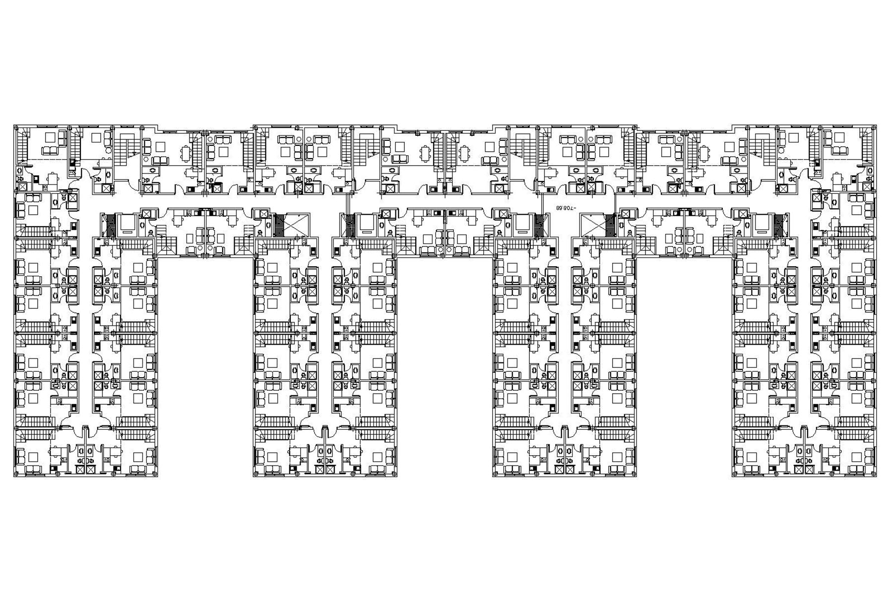 La planta del edificio se desarrolla en forma de peine de manera que todos los apartamentos, de dimensiones reducidas, tengan un gran aporte de luz solar.