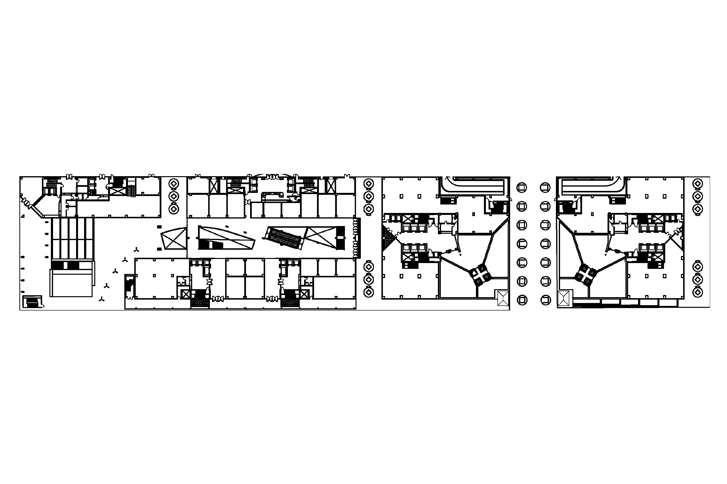 A ambos lados se disponen dos cuerpos de oficinas paralelas de composición lineal y 16 plantas con acceso por calles opuestas.